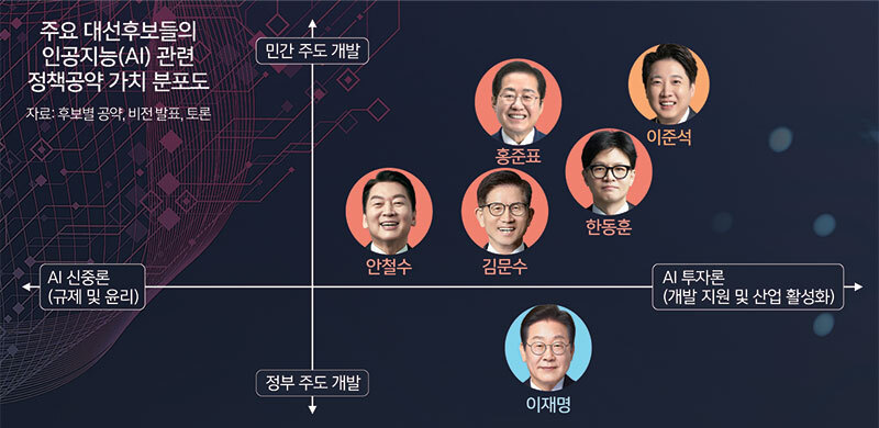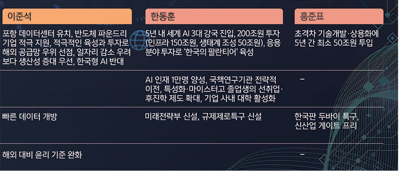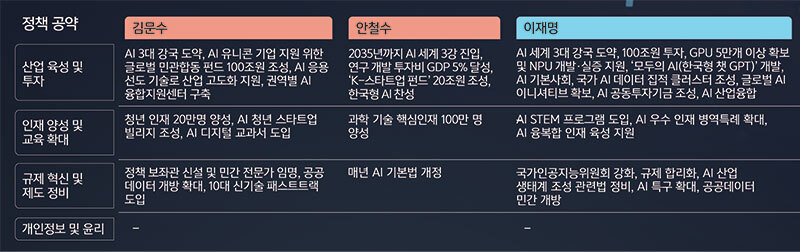 반면 국민의힘 경선 후보들은 민간 주도의 시장 친화적 전략을 앞세웠다. 김문수 후보는 AI 인재 20만명 양성, AI 유니콘 기업 지원 위해 민관합동펀드 100조원 조성, 권역별 AI융합지원센터 구축, 공공데이터 개방 확대, 3대 강국 등을 주장했다. 안랩 창업자인 안철수 후보는 5대 전략산업으로 육성, 3강 진입, 연구개발 투자비중 국내총생산(GDP)의 5% 달성, 과학기술 핵심인재 100만명 양성, 20조원 규모 K스타 펀드, 글로벌 AI협력체 창설 등을 약속했다.