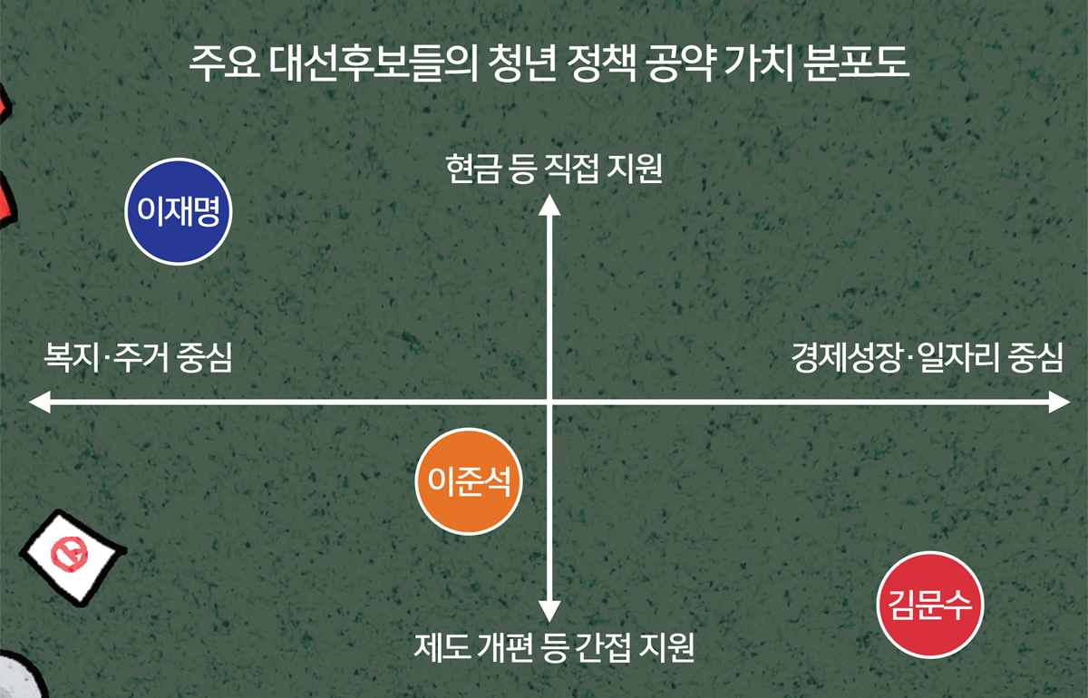 ‘젊을수록 진보 후보 선호’ 공식 깨지고 부동층 청년 비중 늘어 표심 향배 촉각 다양한 계층 요구 고려해 적극 러브콜 주요 후보 강조점 각양각색 이재명, 생애주기별 복지 서비스 제시 김문수, 원룸촌 ‘반값월세존’ 지정 공언 이준석, 신·구세대 연금 재정 분리 제안 단기적 효과에 집중은 한계 고용 양극화·연금 고갈 등 구조적 문제 장기적 관점서 해결할 비전은 안 보여 “전체 국민 삶에 긍정적 정책 설계 필요”