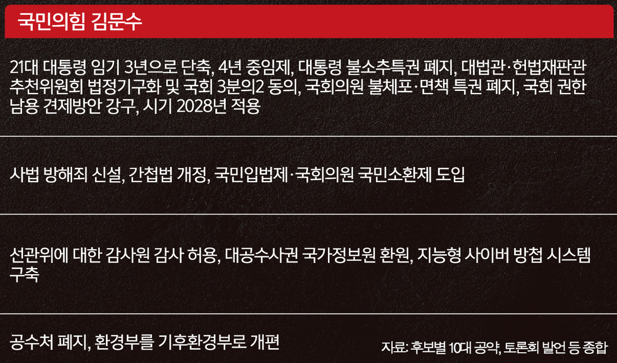국민의힘 김문수 후보는 10대 공약 중 아홉 번째에 오른 ‘특권을 끊는 정부, 신뢰를 세우는 나라’라는 정치제도의 개혁, 독립적 감사제도 확립 등을 앞세웠다.