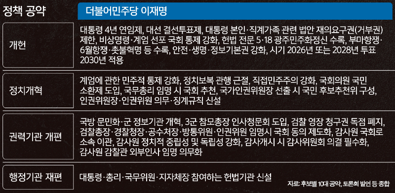 지지율 고공행진을 이어가고 있는 더불어민주당 이재명 대선 후보는 10대 공약에서 정치개혁과 관련해 ‘내란극복’과 ‘국민통합’, ‘민주주의 회복’을 전면에 내세웠다. 대통령 계엄권한에 대한 민주적 통제 강화, 정치보복 관행 근절, 직접민주주의 강화 등을 약속했다.