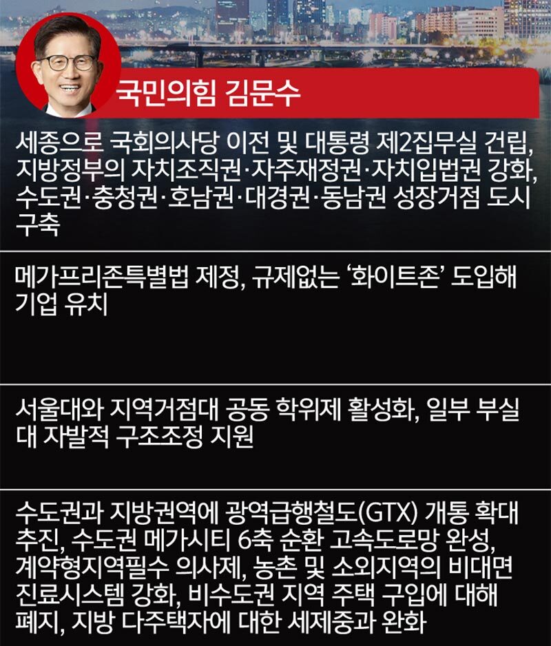 국민의힘 김문수 후보는 광역급행철도(GTX) 확장 등 광역 교통망 건설을 총망라한 메가시티 조성을 핵심 공약으로 내세웠다. 지방정부의 권한 강화를 위한 공약도 강조했다. 기업에 규제가 없는 메가프리존, 한국형 화이트존을 약속했고, 지방 다주택자 중과세 폐지 등 지역 부동산 활성화 대책도 발표해 지역 경제 활성화를 도모하겠다고 했다. 의료 사각지대 문제에 대해서는 계약형 지역필수의사제, 비대면 진료 기반 조성 등을 통한 해소 방안을 공약했다. 이 후보와 김 후보 모두 세종시 행정수도 완성을 공통적으로 약속했다.