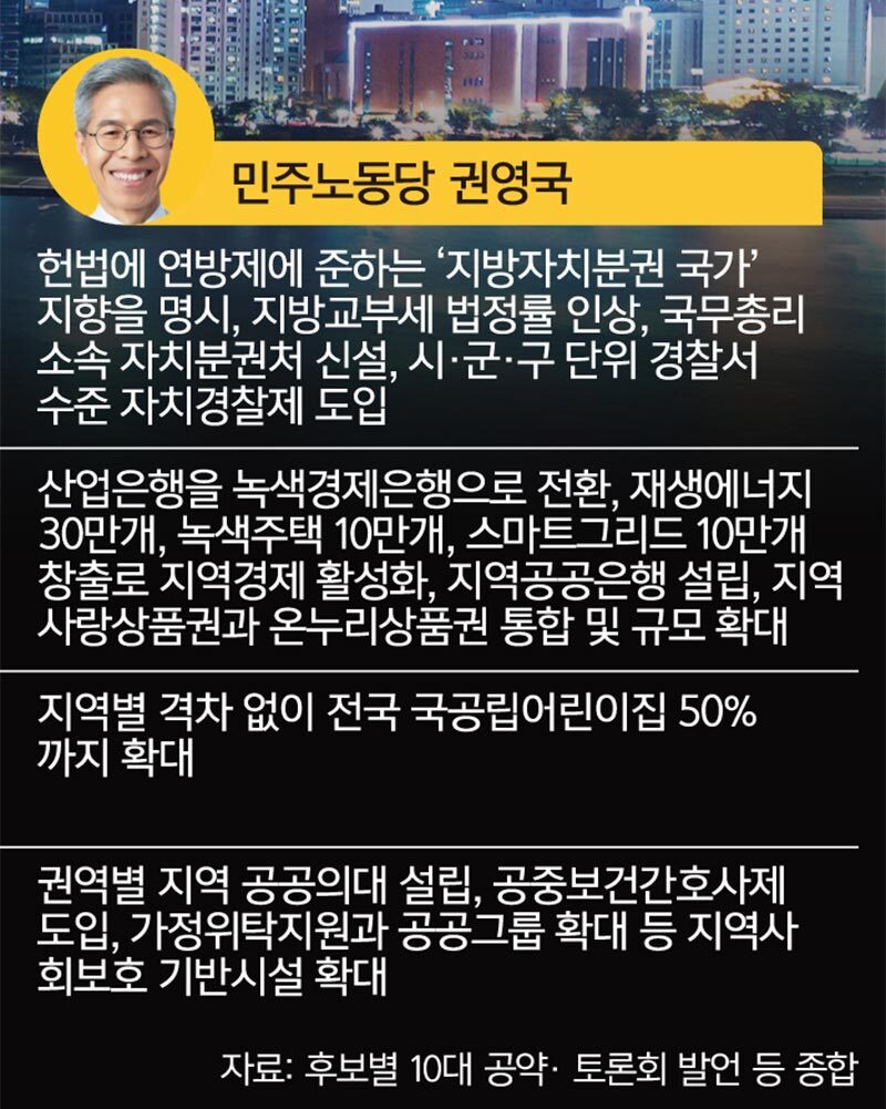 민주노동당 권영국 후보는 헌법에 지방자치분권국가 지향을 명시하겠다는 개헌 공약을 제시했다. 지방은행 설립과 지방세 확대 등을 통해 지방분권을 추진하겠다고 했다. 이에 대해 한 전문가는 “상당히 앞선 지방분권적 내용을 가지고 있지만 재생에너지 30만개, 녹색주택 10만개 등 일자리 창출 공약의 현실성이 얼마나 될지 의문”이라고 꼬집었다.