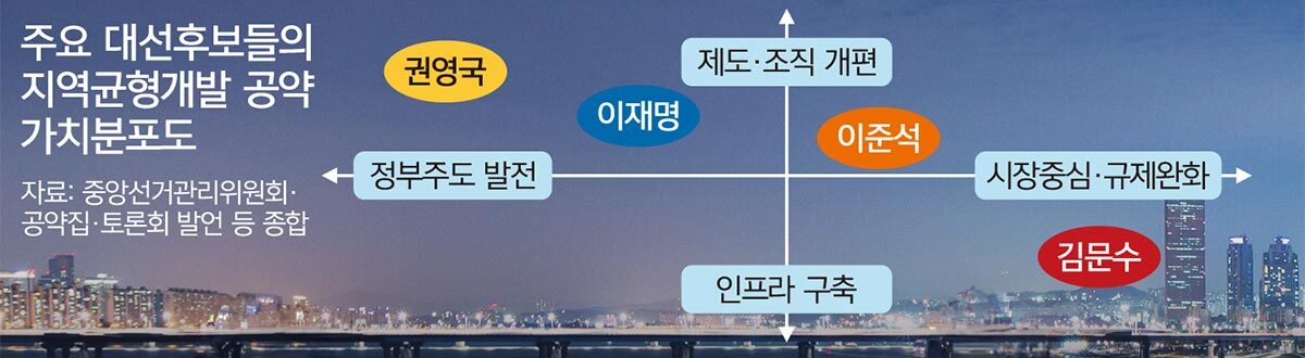 1일 세계일보가 그동안 발표된 주요 대선 후보들의 지방균형발전 공약을 전문가들과 함께 분석한 결과, 후보들은 수도권 과밀화와 지방 소멸에 대한 위기 의식에 공감했지만 과거와 다른 차별화된 공약은 내놓지 못했다.