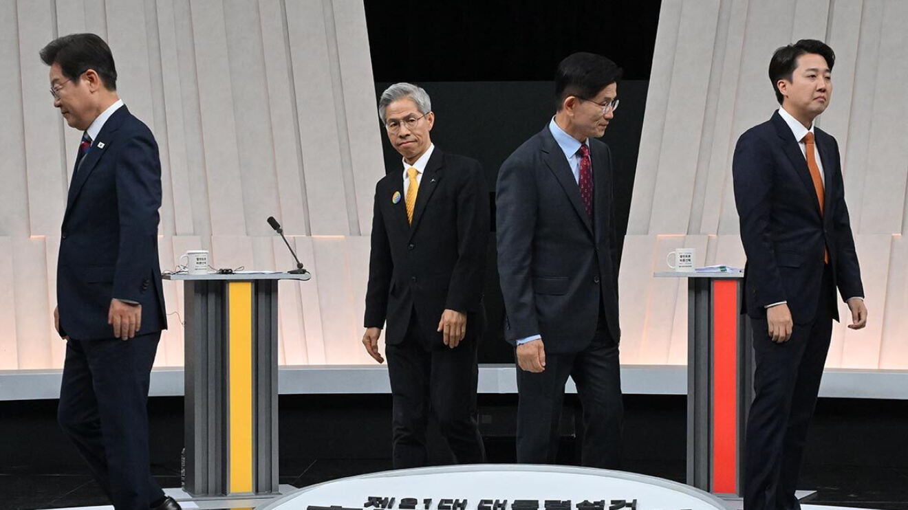 더불어민주당 이재명·민주노동당 권영국·국민의힘 김문수·개혁신당 이준석 대선 후보가 27일 서울 마포구 상암동 MBC 스튜디오에서 진행된 정치 분야 TV토론회에 앞서 포즈를 취한 후 자리로 향하고 있다. 국회사진기자단