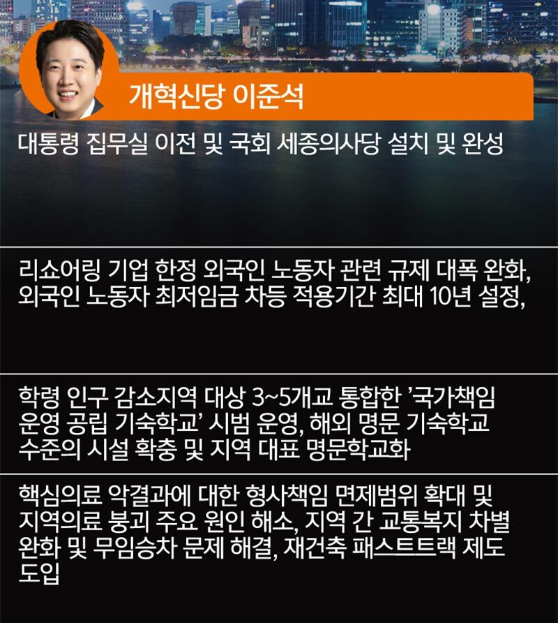 개혁신당 이준석 후보는 리쇼어링(제조업 국내 복귀) 정책을 핵심으로 내세우고 있다. 해외로 나간 제조업을 지방으로 유치해 지역 경제를 활성화시키겠다는 구상이다. 또한 지방거점 명품 공립기숙학교 설립, 노인 교통이용권(12만원) 발급 등을 공약했다. 한 전문가는 “리쇼어링 정책과 외국인 노동자 최저임금 차등적용이 연계되면 실효성에 의문이 든다”고 짚었다.