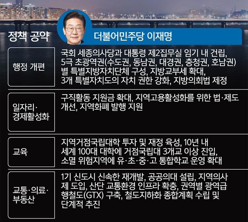 더불어민주당 이재명 대선 후보는 포괄적인 지역균형발전 공약을 제시하고 있다. 행정수도 이전을 통한 입법권·재정권·조정권의 지방 이양을 내세우며 ‘5극3특’(5개 광역경제권, 3개 특별지자체) 권역별 특화발전 전략을 강조했다. 특히 지역사랑상품권과 지역화폐 확대, 주민참여예산 강화를 핵심으로 내세웠다. 이 후보는 또한 ‘서울대 10개 만들기’ 공약을 통해 지역 거점 국립대학을 서울대 수준으로 육성하겠다고 공약했다. 공공의대 설립과 지역의사제 도입으로 의료격차 해소에 나서겠다고도 했다.