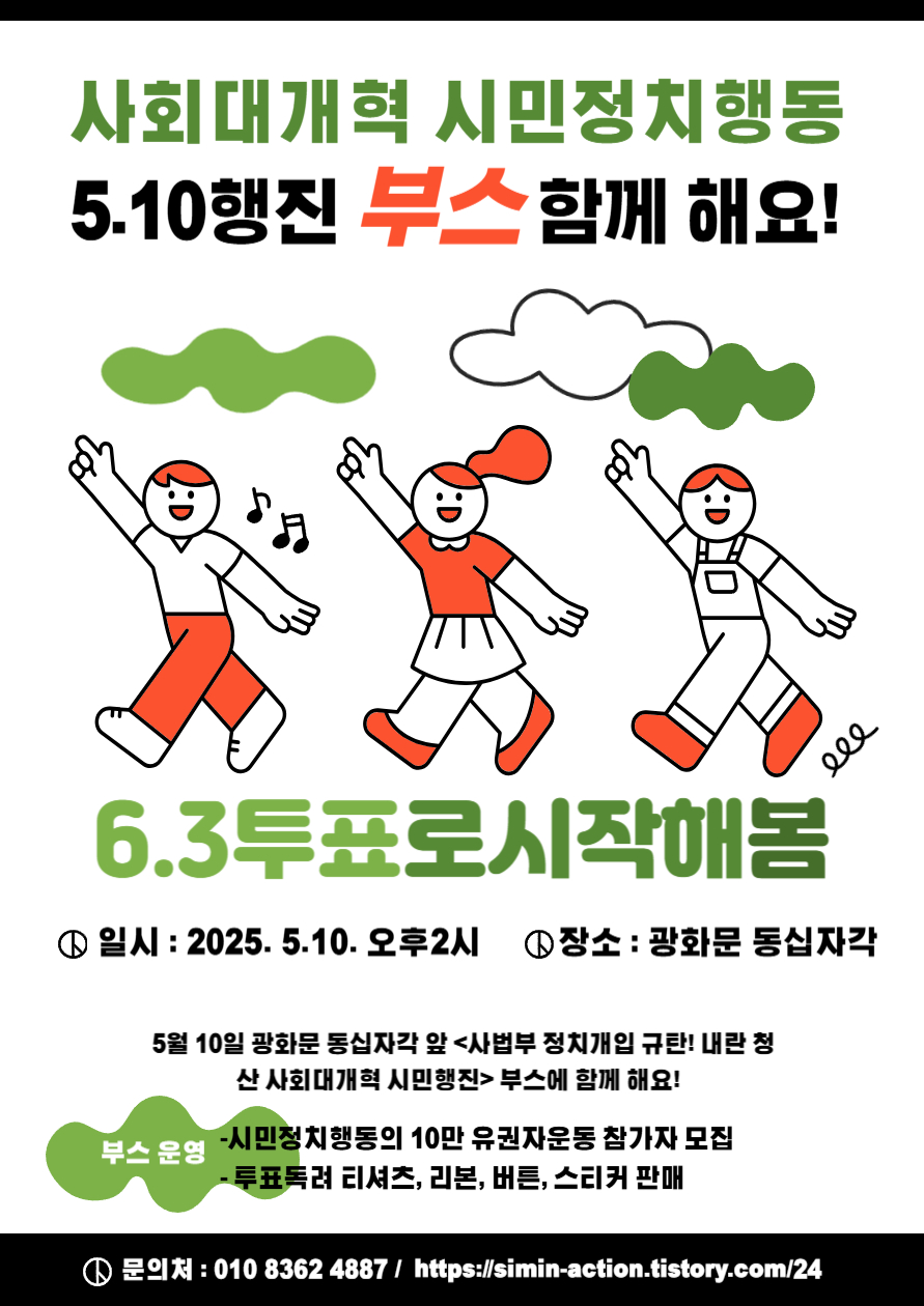 | 5.10(토) 사회대개혁 시민정치행동 유권자운동본부 '유권자의 날' 비상행동 집회 부스 활동 (0) | 2025.05.12 |