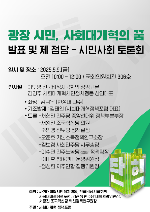 | [카드뉴스]시민정치행동 발족식/ 출범식 및 1만인 선언식/광장시민,사회대개혁의 꿈 발표 및 제정당 시민사회 토론회 (0) | 2025.05.15 |