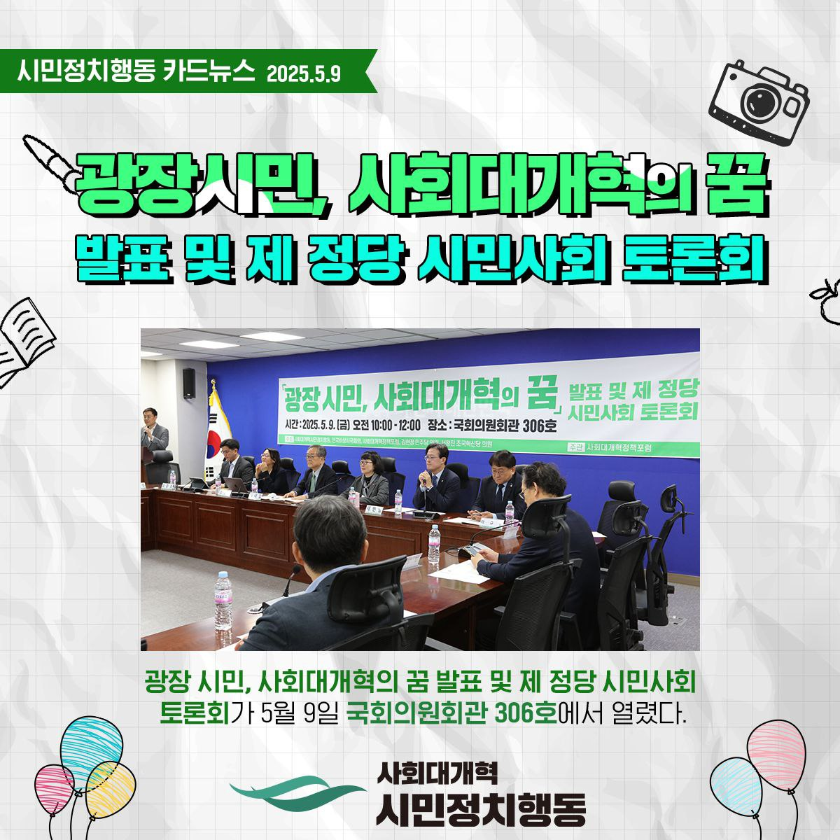 | 「광장시민, 사회대개혁의 꿈」 발표 및 제정당-시민사회 토론회 (0) | 2025.05.09 |