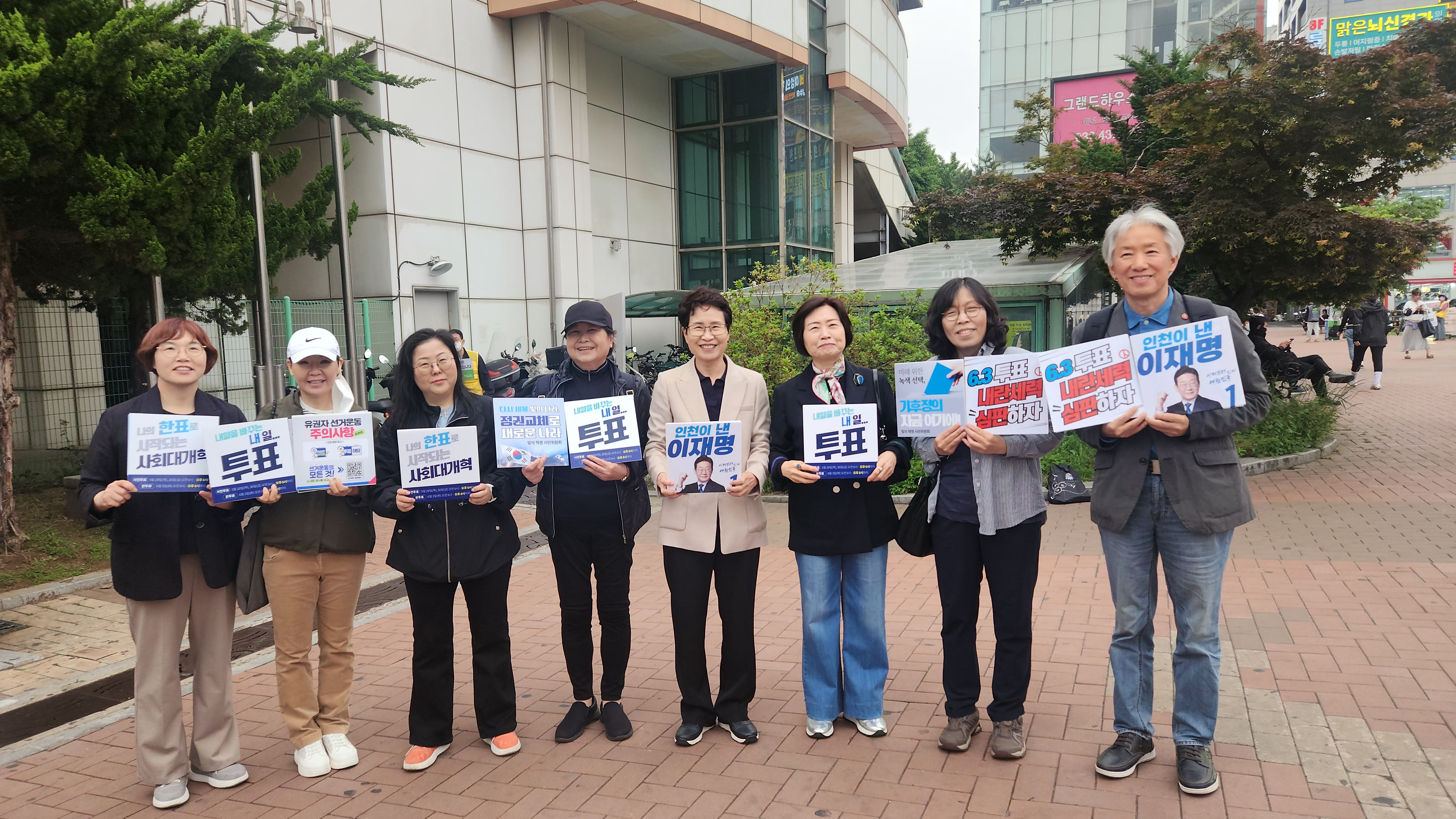인천광장정치연합에서 5월 20일 '나의 한표로 시작되는 사회대개혁', '내일을 바꾸는 내일...투표', '다시 세울 빛의 나라, 정권교체로 새로운 나라', '미래를 위한 녹색선택, 기후정의 지금 여기에', '6.3투표 내란세력 심판하자', '인천이 낸 이재명' 등의 손 피켓 구호를 들고 유권자운동을 벌였다.