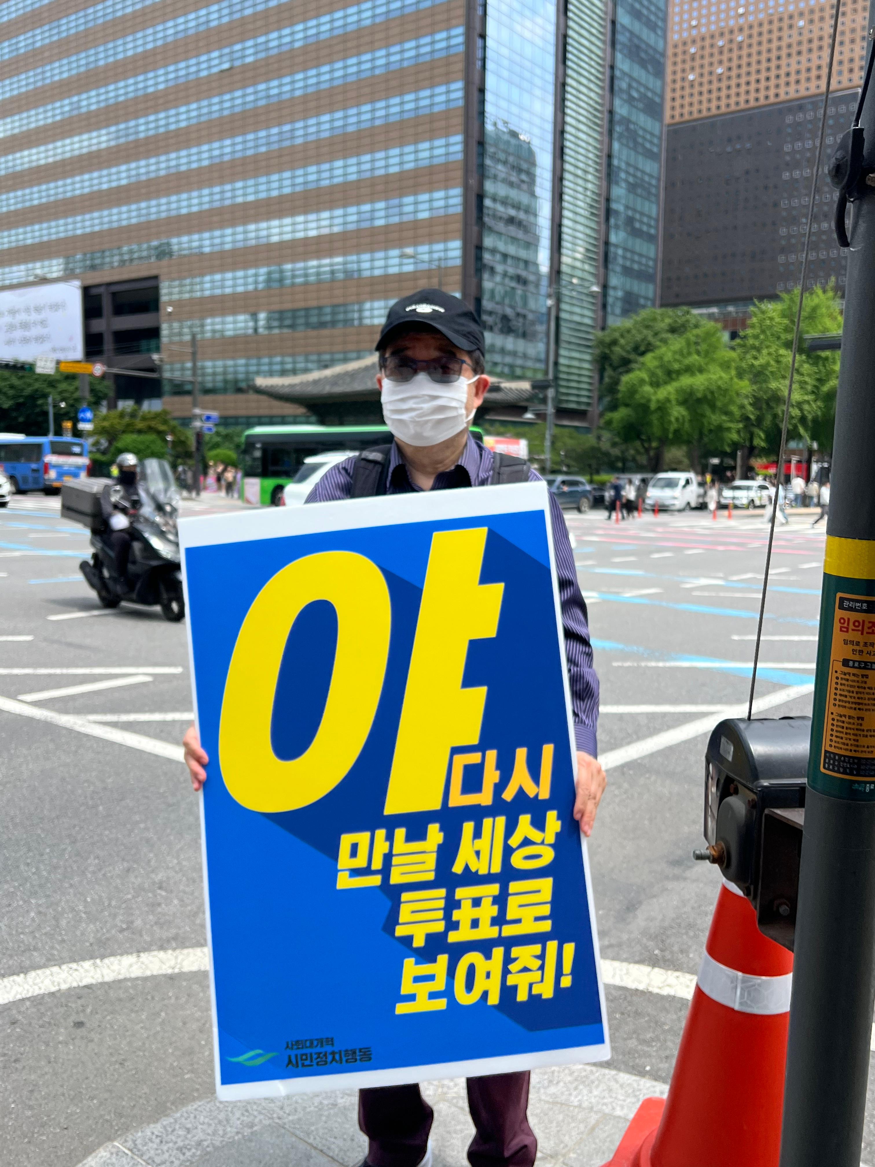 5월 21일 수요일 오전 11시 30분~12시 30분 광화문 일대에서 시민정치행동 유권자운동본부가 2차 유권자운동을 벌였다. 전국비상시국회의, 참교육동지회, 노후희망유니온, 조선일보폐간시민실천단, 전국목회자정의평화협의회 등 참석인원 17명이 함께 했다.그리고 5/23(금) 동시다발 투표참여 피케팅이 있을 예정이다. 대학가, 전철역 등에서 5인조 이상으로 투표참여 캠페인을 진행하시고 사진을 메일로 보내주시기 바랍니다. (메일:siminaction1@gmail.com)