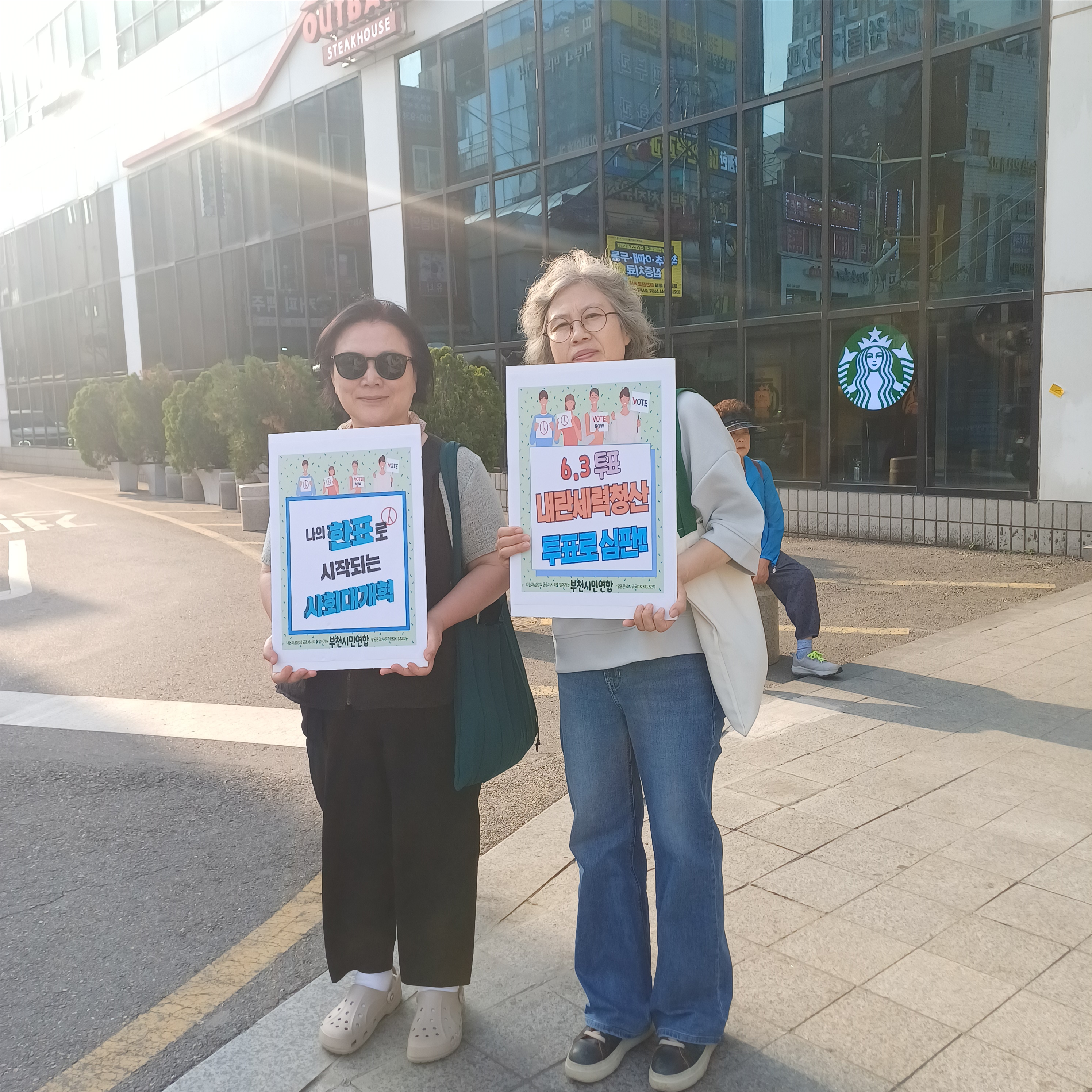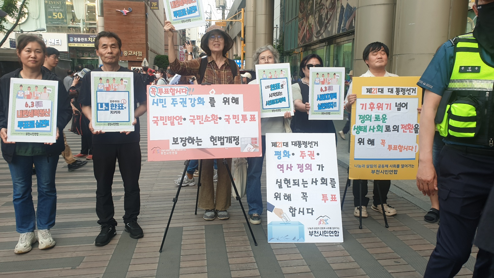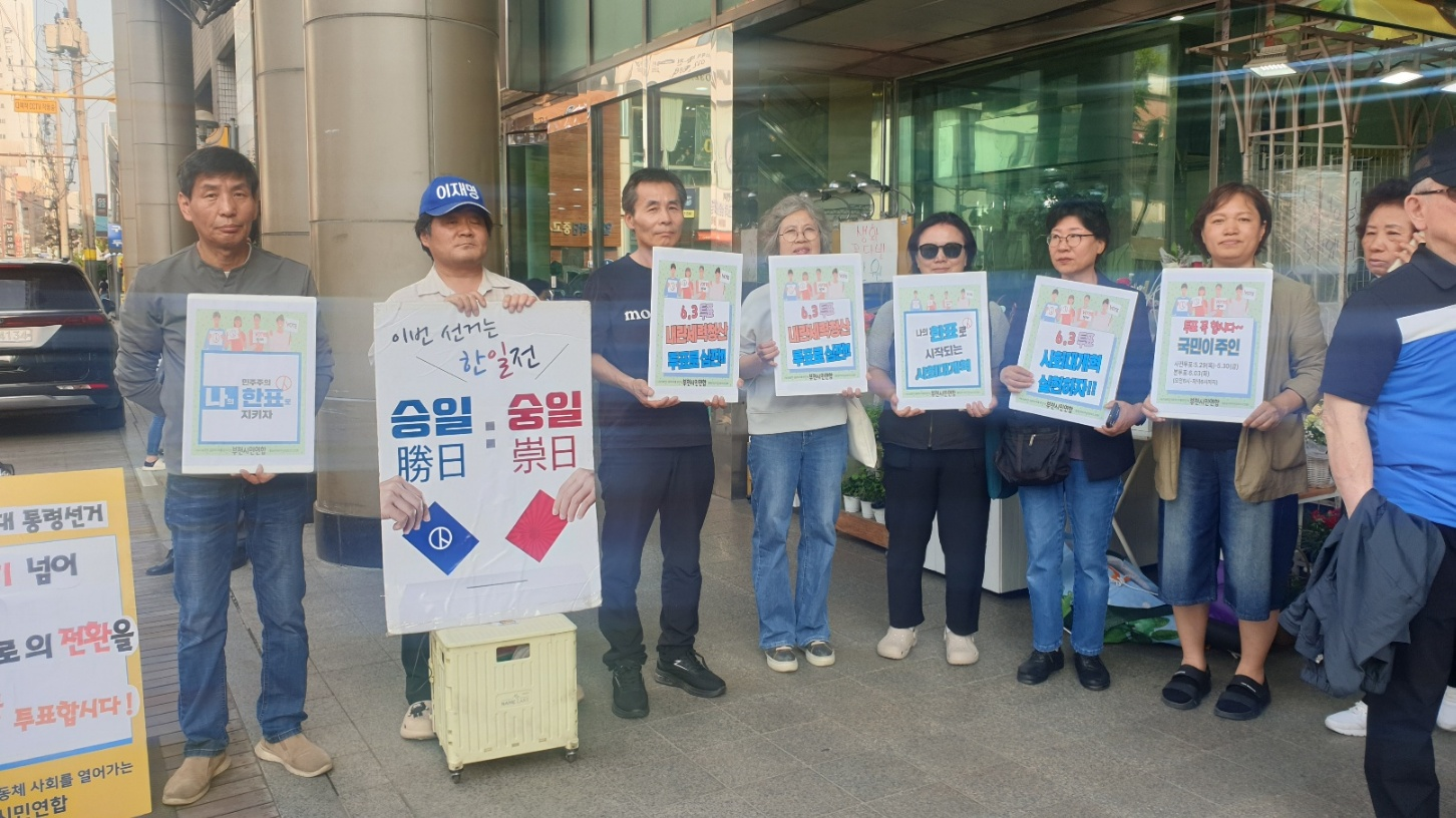 5월 22일 목요일 저녁 5시 30분 ~ 7시 00 부천역 마루광장에서 '부천시민연합', '주권자전국회의 부천지회' 등의 회원들이 '나의 한표로 시작되는 사회대개혁', '6.3투표 내란세력청산 투표로 심판', '민주주의 나의 한표로 지키자', '이번 선거는 한일전 승일, 숭일', '투표 꼭 합시다. 국민이 주인' 등을 구호가 적힌 손피켓을 들고 유권자운동을 펼쳤다.